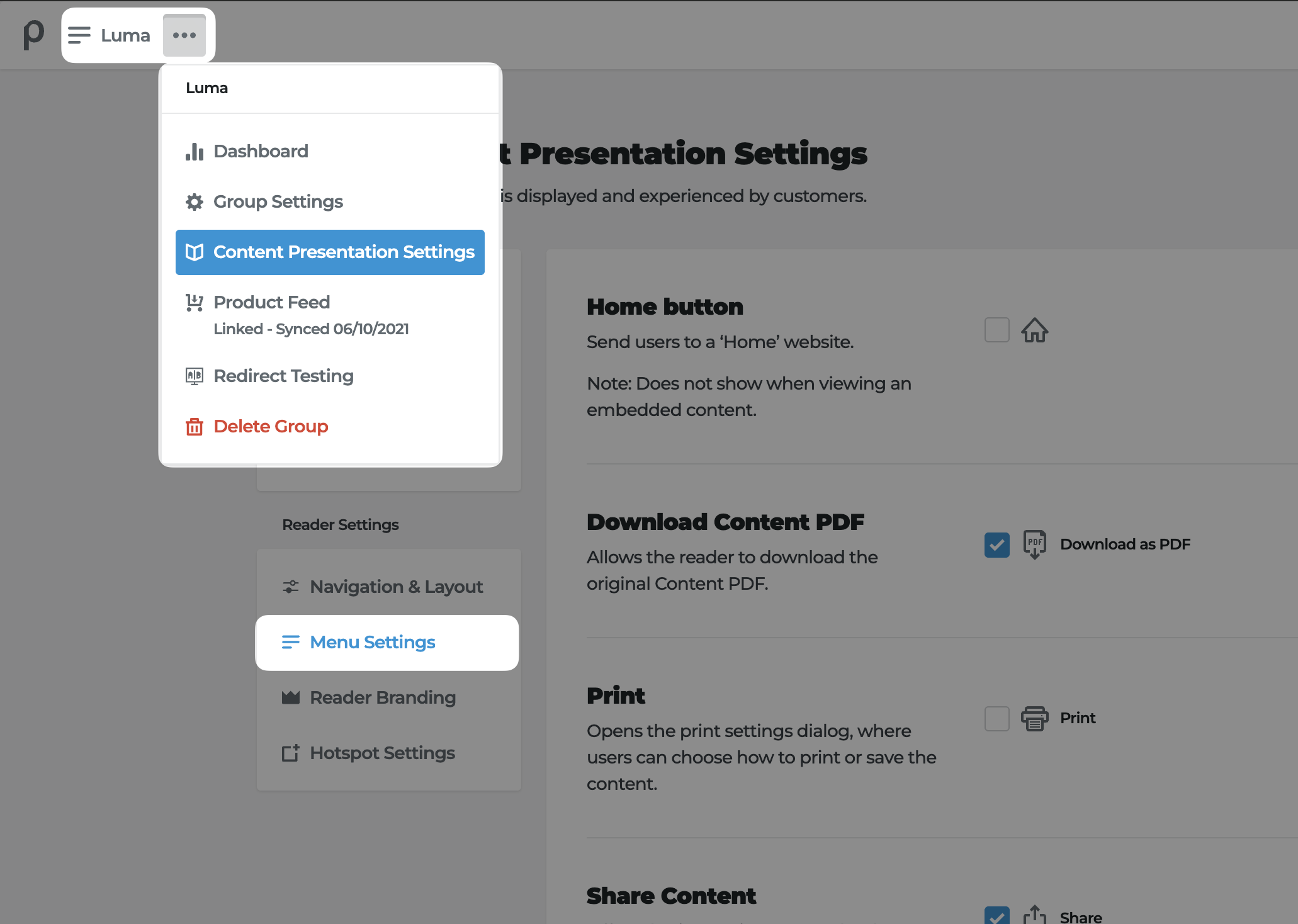 - Go to the Menu Settings tab of the Content Presentation Settings:
