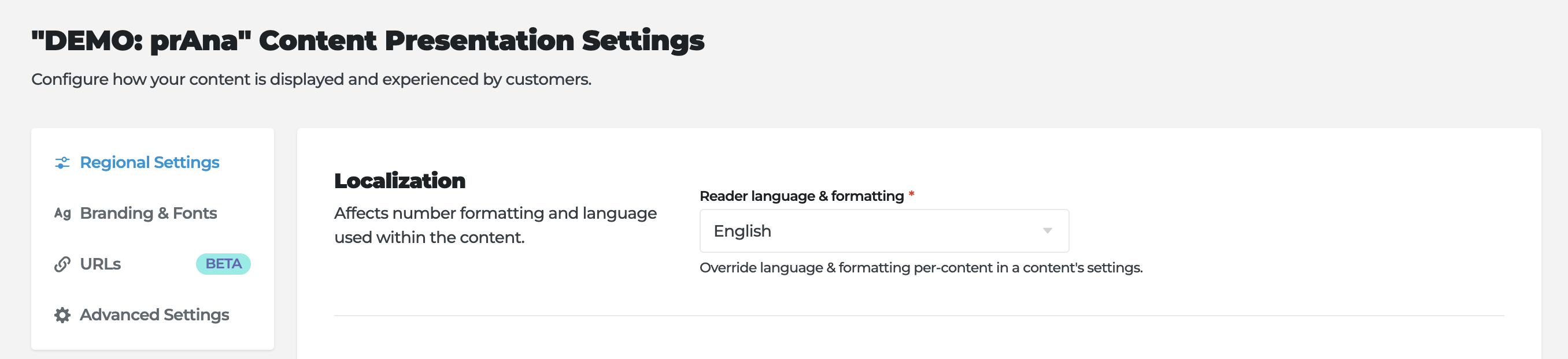 In the Display & Formatting tab of the publication settings you can also select a reader language which will overwrite the default value set in the Content Presentation Settings menu. The selected value will only apply to the selected publication.