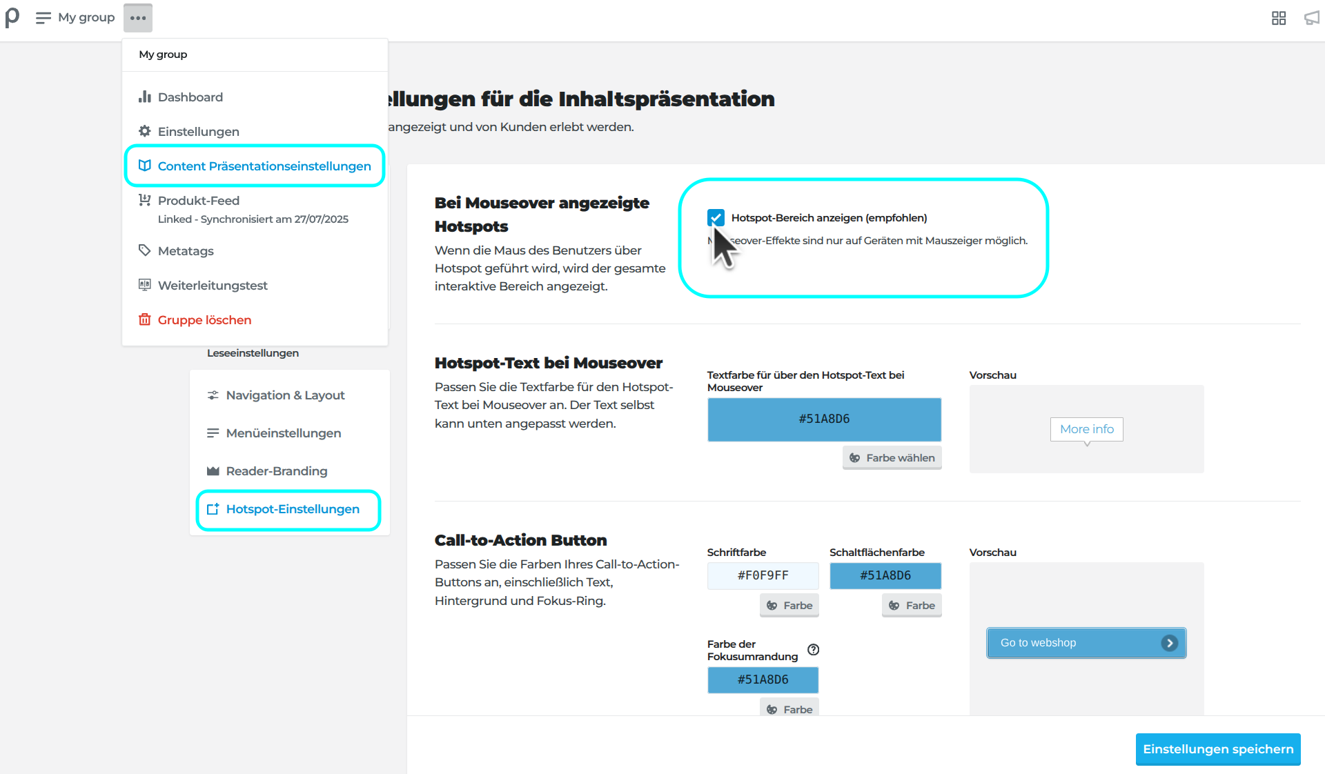Wie bereits erwähnt, können Hotspots hervorgehoben werden, wenn die Maus über den anklickbaren Bereich bewegt wird. Dies ist eine einfache und empfohlene Methode, um die Klickrate auf Desktop-Geräten zu erhöhen. Das ist auch der Grund, warum diese Option standardmäßig aktiviert ist: