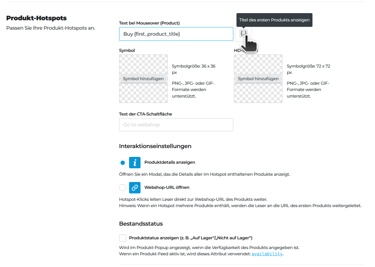 Wie bei den Produkt-Hotspots kannst du auch den Produkttitel (des ersten Produkts) im Maus-Hover-Text verwenden, indem du den Platzhalter {first_product_title}: setzt
