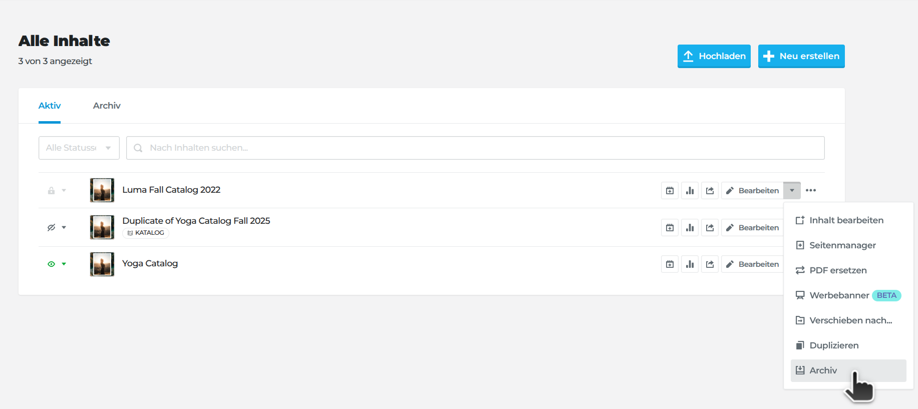 Du kannst deine Publikationsliste bereinigen, indem du alte Publikationen ins Archiv verschiebst. Diese werden nicht gelöscht, sondern sicher gespeichert, falls du diese wieder benötigst. Wenn du möchtest, dass eine Publikation für immer entfernt wird, kannst du sie aus dem Ordner “Archiv” dauerhaft löschen: