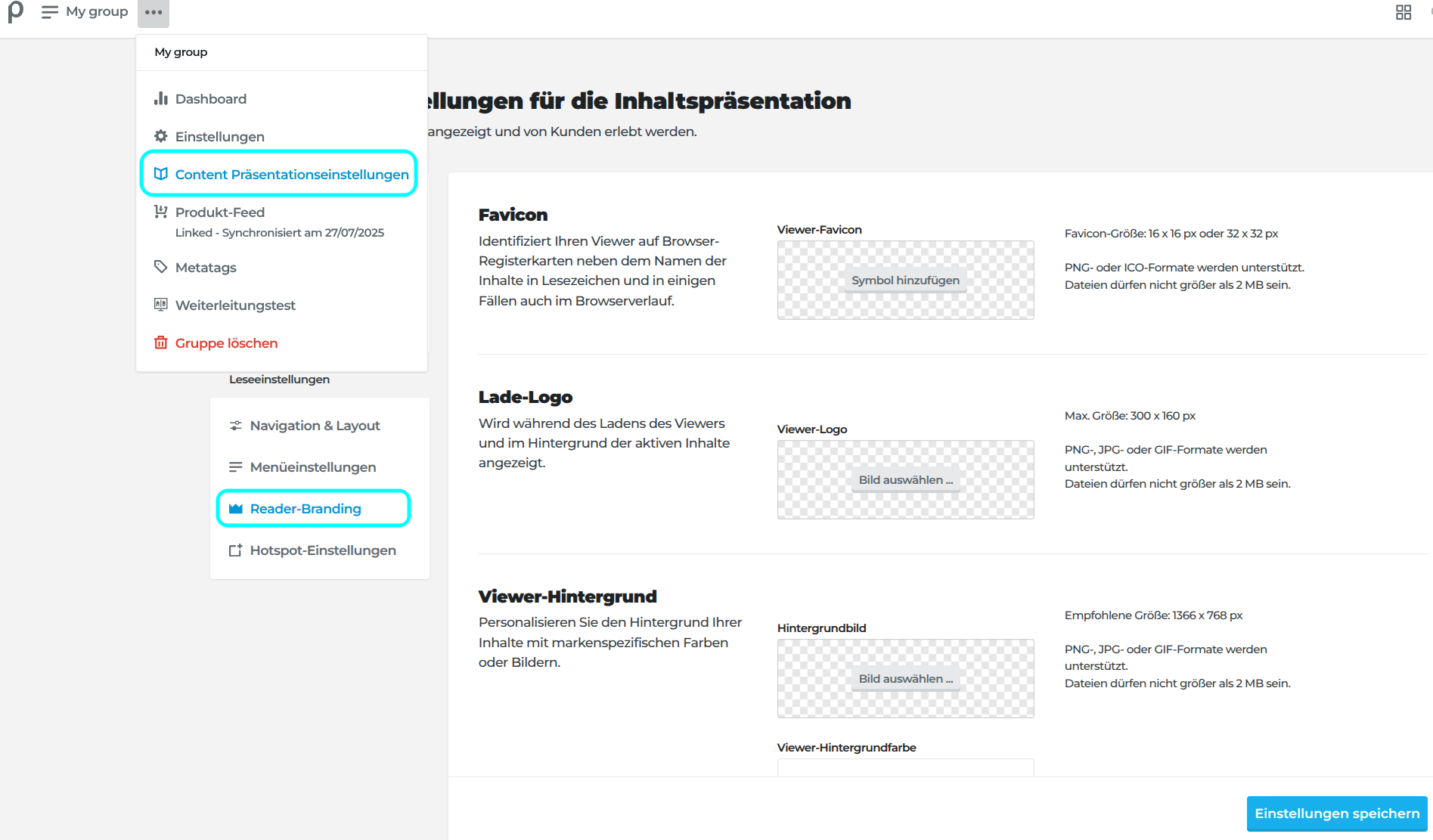 Klicke auf den dreifachen Punkt oben links (...) und dann auf Content Präsentationseinstellungen -> Reader Branding. Hier kannst du ganz einfach ein Hintergrundbild, ein Favicon oder ein Logo zu deinen Publikationen hinzufügen. Alle Änderungen, die du hier vornimmst, werden für alle Veröffentlichungen deiner Gruppe übernommen.