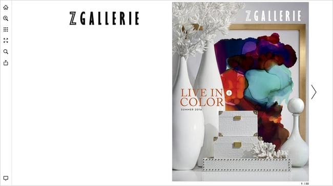 Das einzigartige Z Gallerie-Logo ist sofort sichtbar, und es wurden benutzerdefinierte Hotspot-Symbole in der Farbe der Hauptmarke hinzugefügt. Eine weitere wichtige Funktion, die sie nutzen, ist die benutzerdefinierte Domäne. Anstatt view.publitas.com in der URL ihrer Publikation zu verwenden, haben sie diese in catalog.zgallerie.com geändert. Dies passt nicht nur besser zu ihrem Branding, sondern verbessert auch die Platzierung ihrer Online-Kataloge in den Ergebnisseiten der Suchmaschinen.