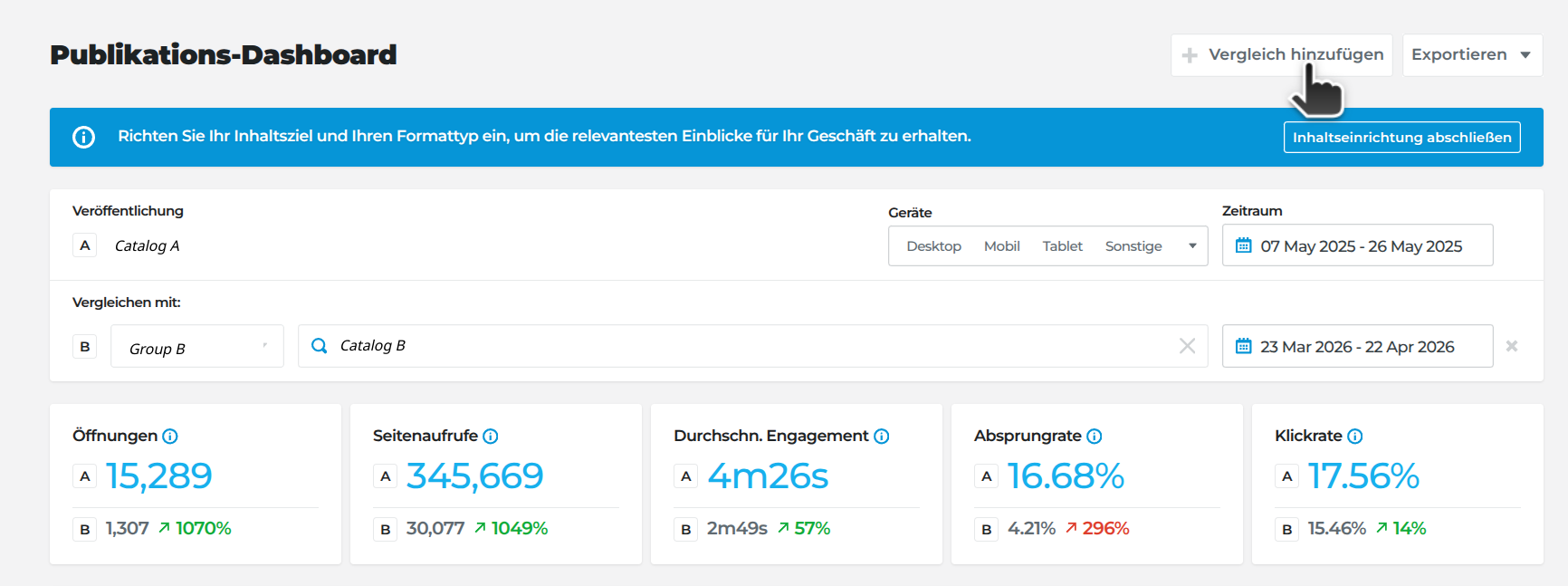 Willkommen zu dieser Anleitung zum Vergleichen von Publikationsanalysen! Mit dieser Funktion kannst du die Performance verschiedener Publikationen direkt vergleichen, um Erkenntnisse zu gewinnen und datenbasierte Entscheidungen zu treffen.
