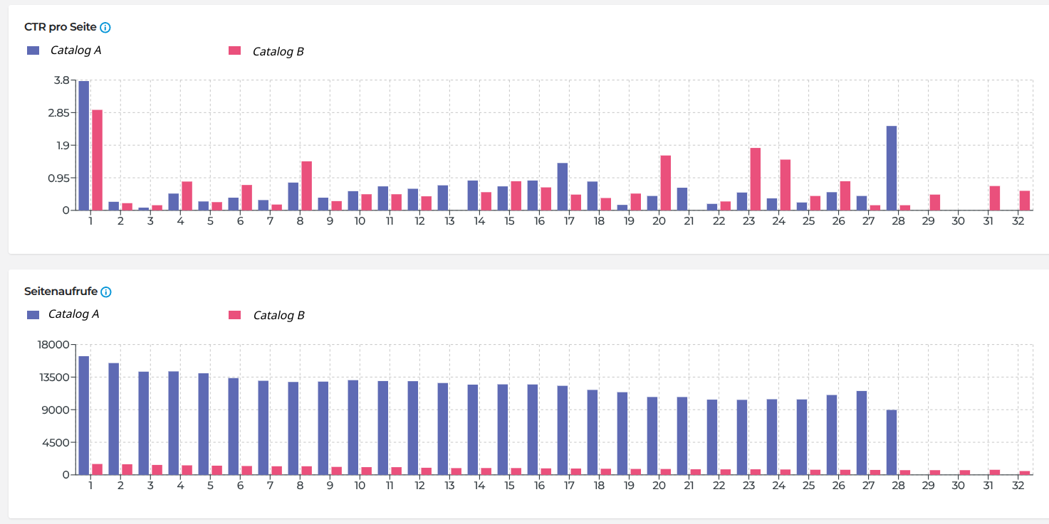 Im obigen Beispiel wurden zwar beide Publikationen jeweils genau eine Woche lang veröffentlicht, eine Publikation war jedoch deutlich länger. Deshalb zeigen die Diagramme nach Seite 22 nur noch Informationen für eine Publikation an. Die Kennzahl für die Anzahl der Seitenaufrufe ist hier ebenfalls weniger relevant. Trotzdem kann der Trend visuell analysiert werden. Die Absprungrate und die Klickrate sind aussagekräftiger.
