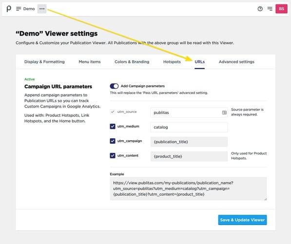 Konfiguriere die UTM-Parameter im Tab URLs des Menüs Publikations-Lesebereich. Immer wenn in einer digitalen Publikation auf einen Link geklickt wird, werden die ausgewählten UTM-Parameter automatisch an die URL angehängt. Dazu gehören Link-Hotspots, Produkt-Hotspots und die Home-Schaltfläche im Menü (Hotspots für externe Inhalte unterstützen diese Funktion nicht).