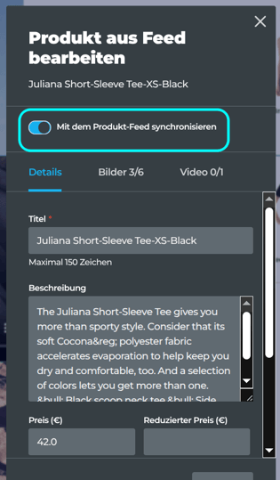 - Um die Details manuell zu aktualisieren, musst Du die Synchronisierung mit dem Feed für dieses Produkt deaktivieren. Dadurch wird verhindert, dass die Synchronisierung diese Änderungen rückgängig macht.