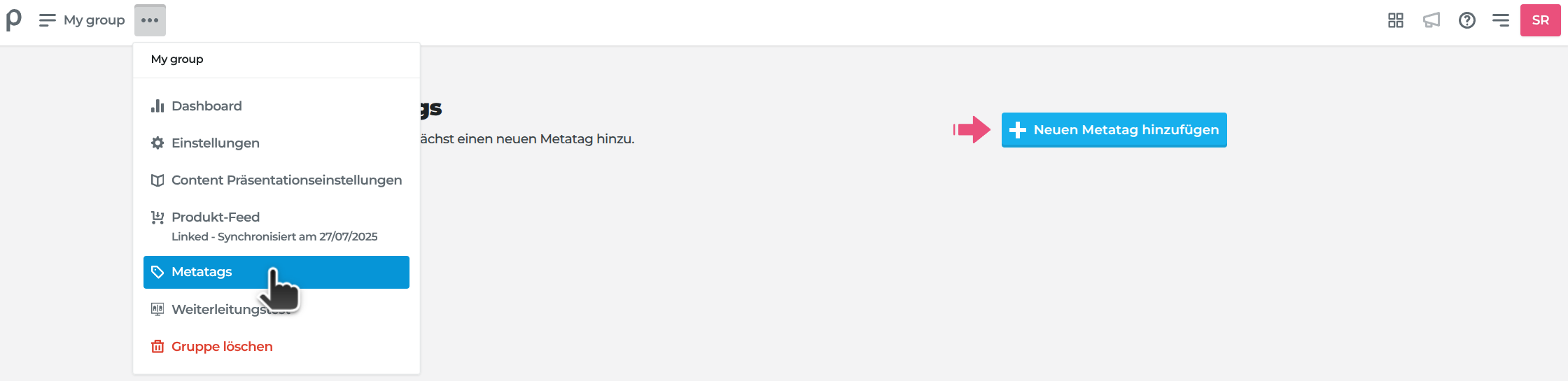 Metatags werden pro Gruppe erstellt und gespeichert. Um Metatags zu verwalten, klicke in den Menüoptionen der Gruppe auf die drei Punkte ••• neben dem Gruppennamen und wähle Metatags aus.