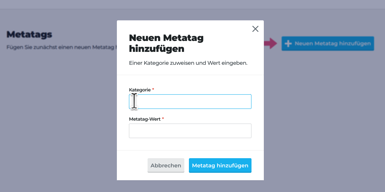 Wähle oben rechts in der Übersicht auf Gruppenebene die Option Neuen Metatag hinzufügen aus, um einen neuen Metatag zu erstellen. Gib einen Kategorienamen und einen Wert für den Metatag ein und klicke auf Metatag hinzufügen.