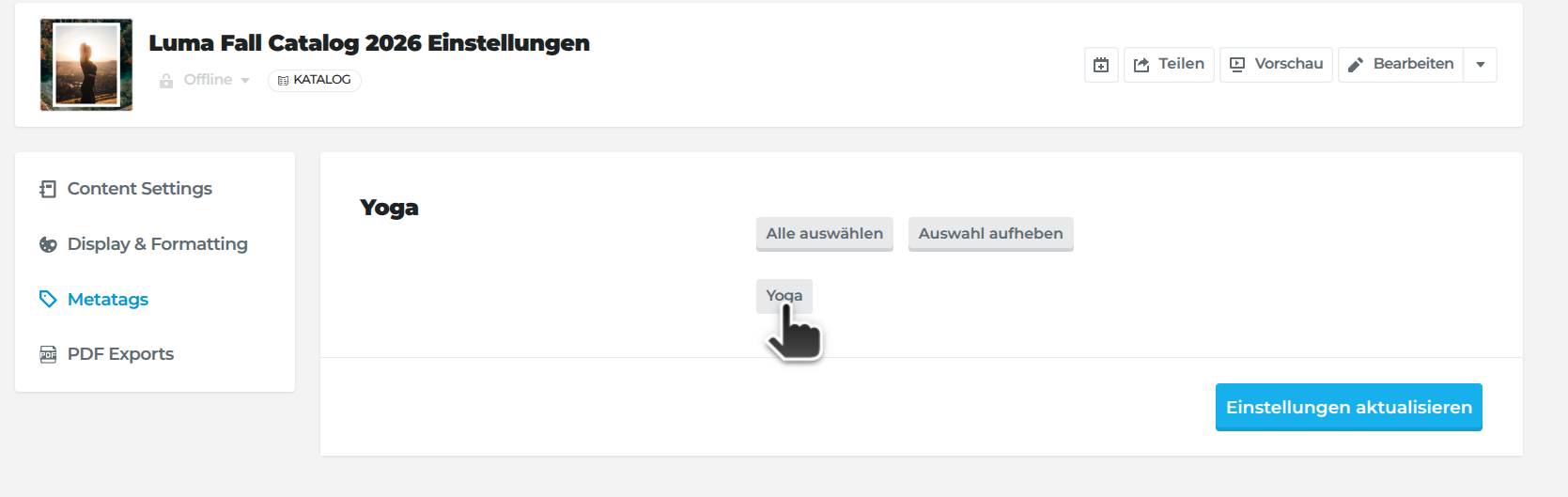 Wähle die zutreffenden Metatags aus oder nutze pro Kategorie die Option Alle auswählen und speichere die Auswahl, indem du auf Publikation speichern und aktualisieren klickst.