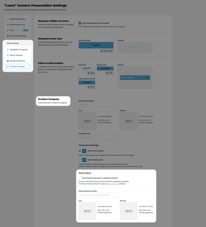 Once the feed contains the necessary stock information, you can enable the Show Product status option in the Hotspot Settings tab of the Content Presentation Settings menu.