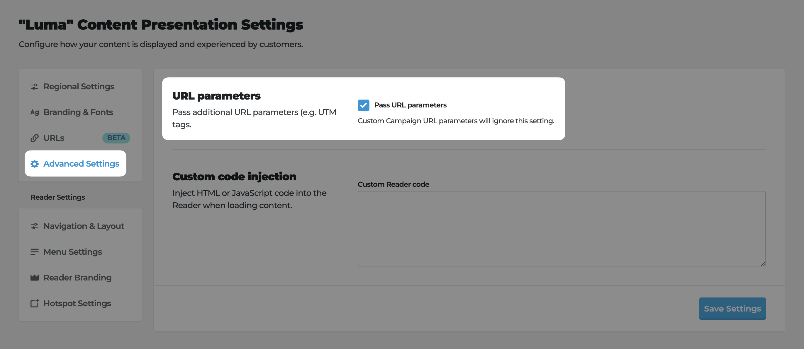 The option is located in the Advanced Settings tab of the Content Presentation Settings menu. With the option enabled, the Reader will look for URL parameters appended to the publication URL and automatically append the same parameters to all outgoing links when found and clicked in the publication.