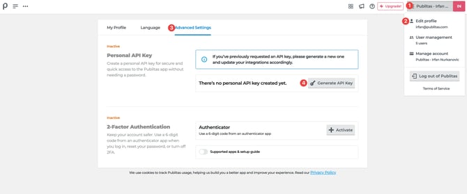 Alternatively you can send a request to support@publitas.com along with the email address of the admin user you wish the API_key to be connected to. Within one business day you will receive the new API_key.